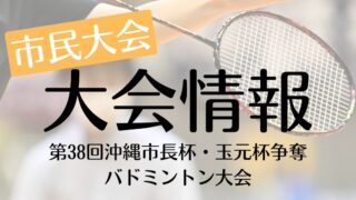 市民大会 【県内大会情報】2026.02.15 第38回沖縄市長杯・玉元杯争奪バドミントン大会 大会情報大会名:第38回沖縄市長杯・玉元杯争奪バドミントン大... 2026.01.16 市民大会県内大会情報