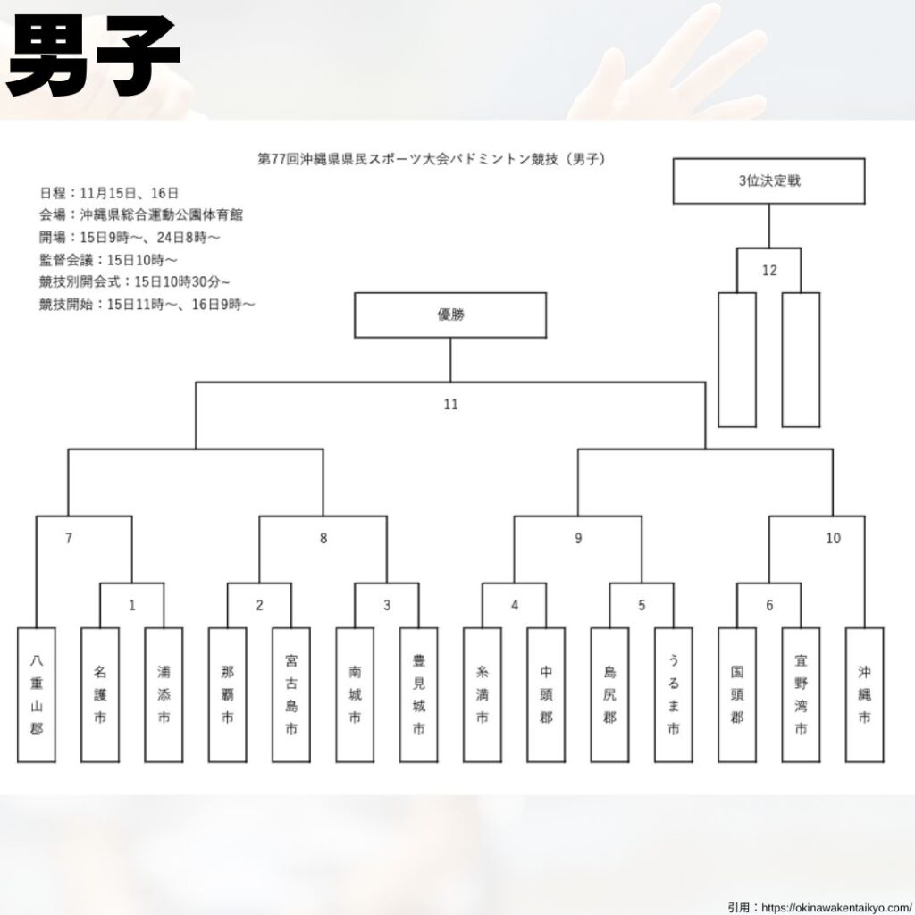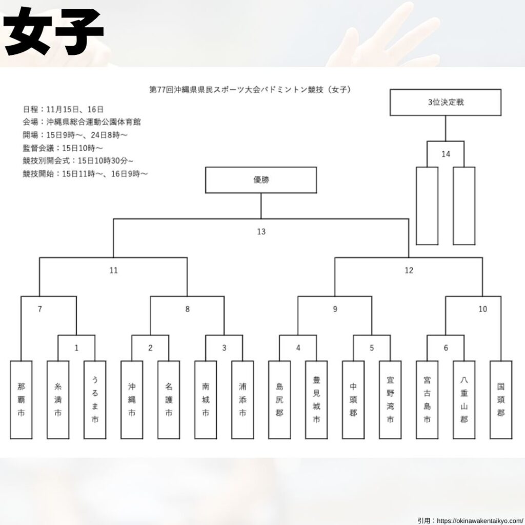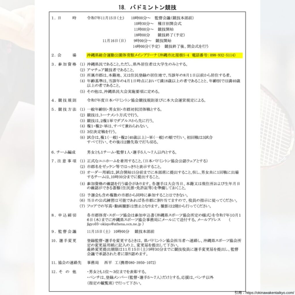 沖縄県バドミントン協会県内大会情報 2025年度R7年度シングルスダブルス団体戦大会組合せ大会結果大会要項県民スポーツ大会県民体育大会 【県内大会情報】2025.11.15〜11.16 第77回沖縄県民スポーツ大会バドミントン競技 沖縄県バドミントン協会 2025.11.06 目次 大会要項組合せ大会会場 大会要項 組合せ 詳細は以下のURLをご確認ください! 公益財団法人沖縄県スポーツ協会ホームページです。公益財団法人沖縄県スポーツ協会です。大会情報や結果などスポー... 大会会場 沖縄県総合運動公園体育館メインアリーナ
