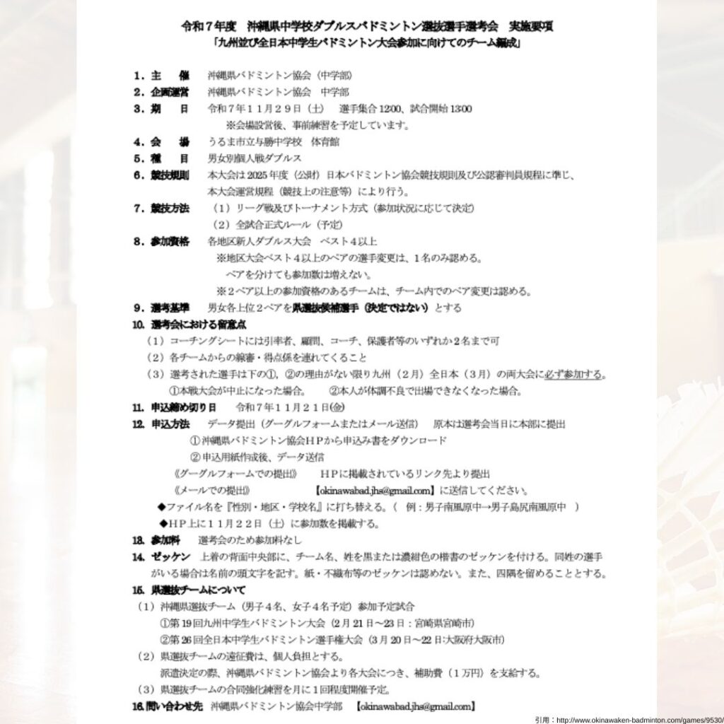 令和7年度 沖縄県中学校ダブルスバドミントン選抜選手選考会|沖縄県バドミントン協会