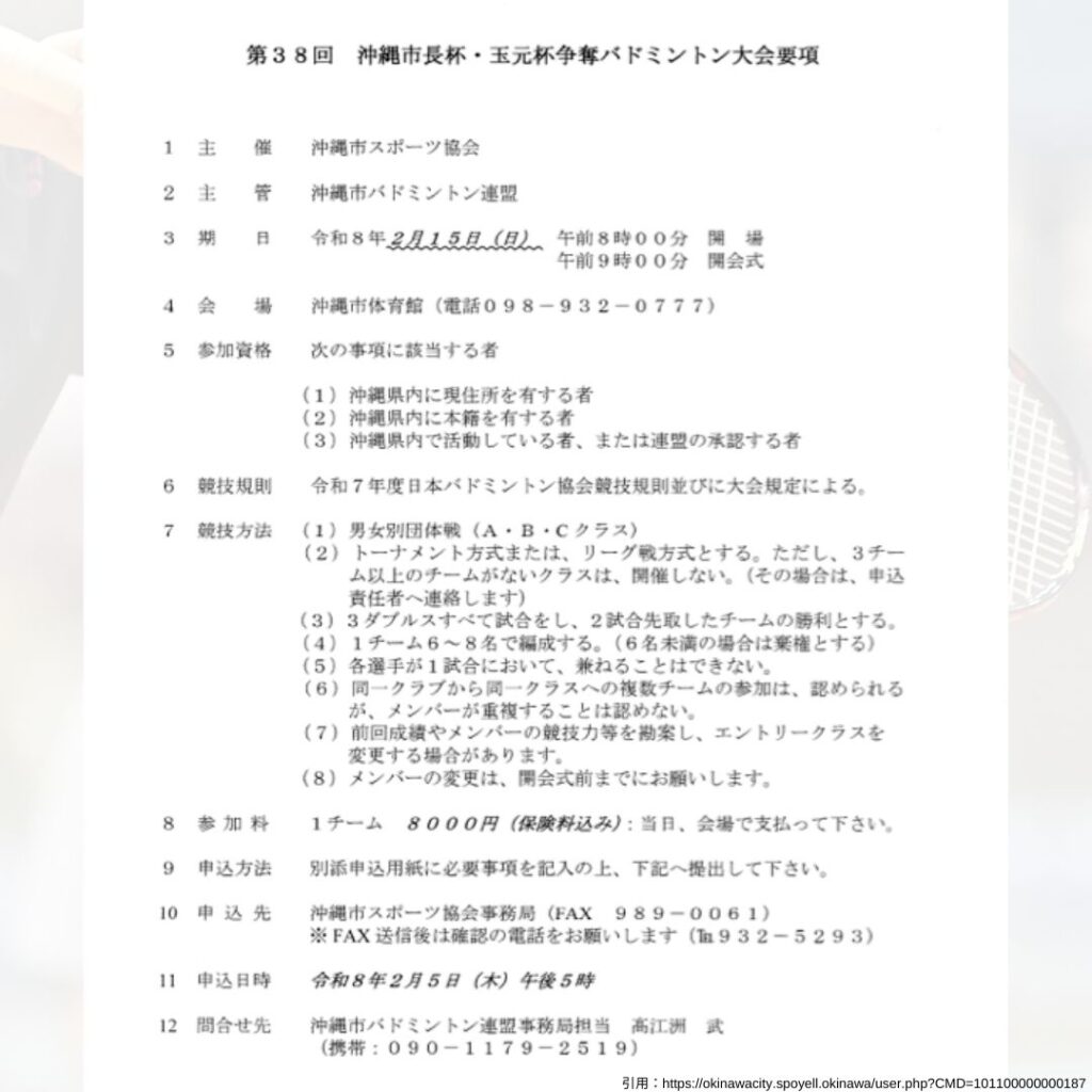 第38回沖縄市長杯・玉元杯争奪バドミントン大会について 沖縄市バドミントン専門部|沖縄市スポーツ協会ホームページです。