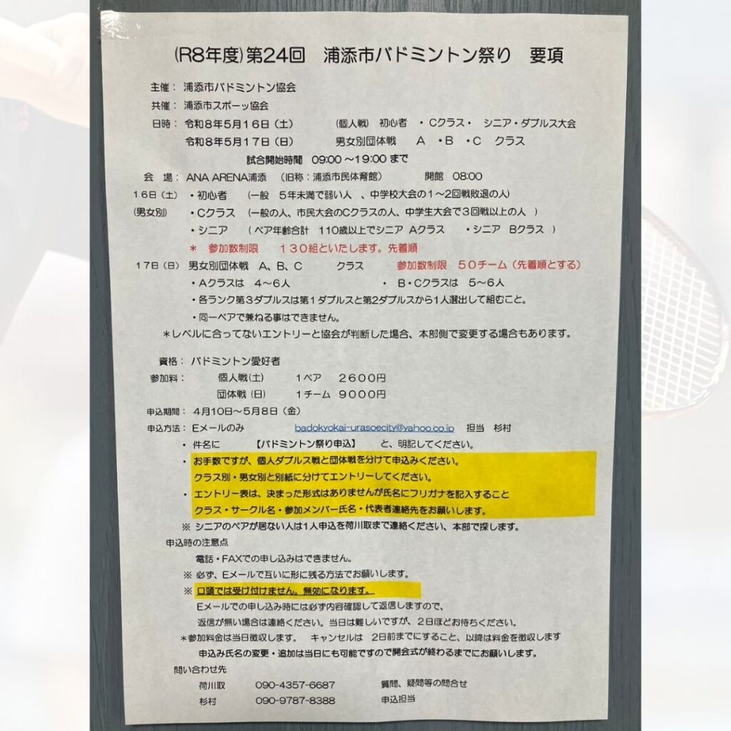 | 主催 | 浦添市バドミントン協会 |